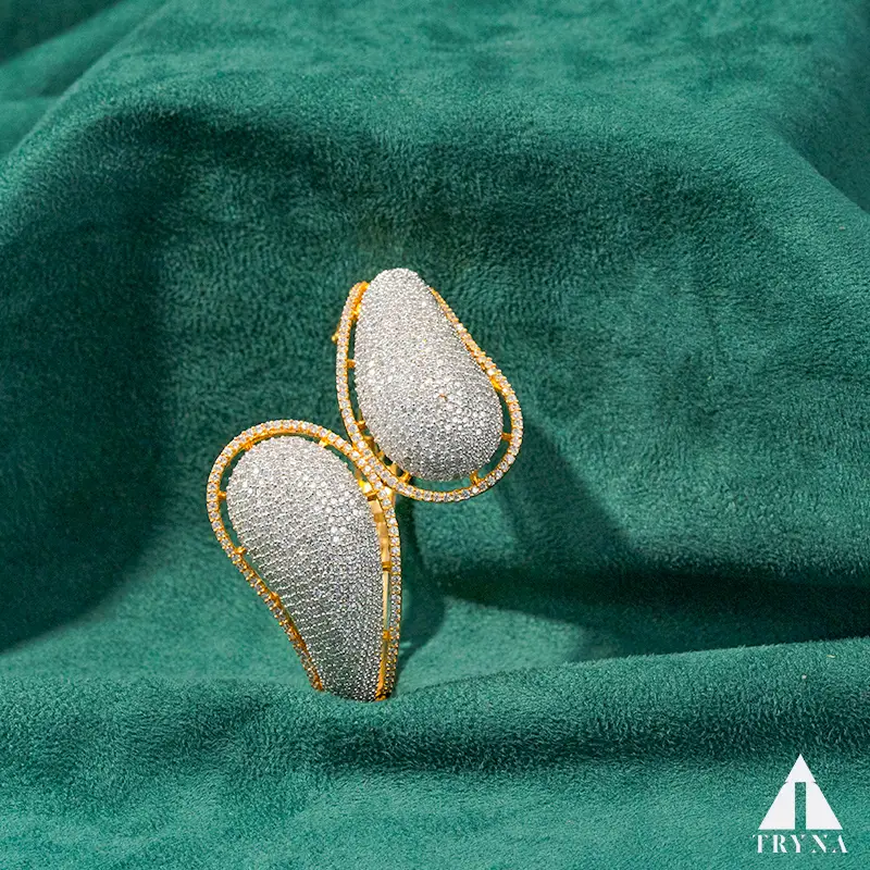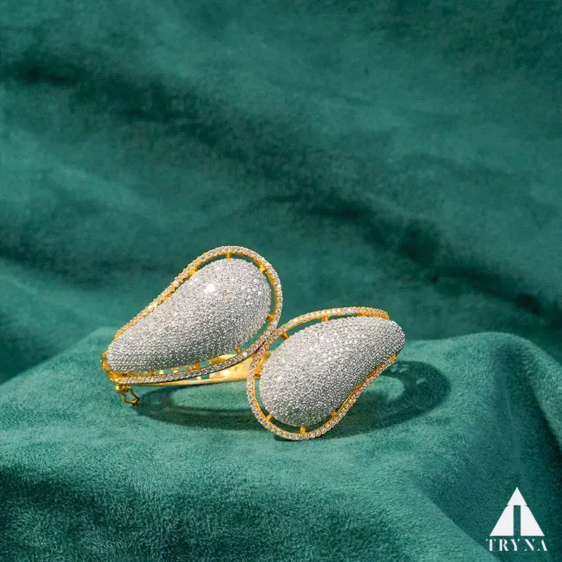 Gold-plated open cuff bracelet with dual teardrop motifs fully studded with American diamonds.
