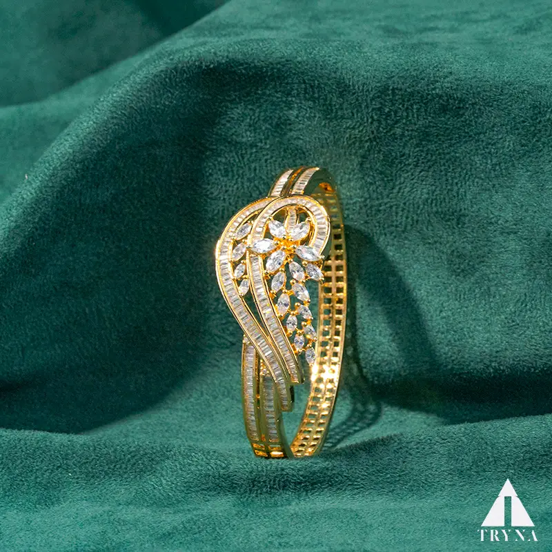 Gold-plated hinged kada/bangle with baguette pavé and marquise cluster centerpiece; elegant tapered profile for solo wear or stacking.
