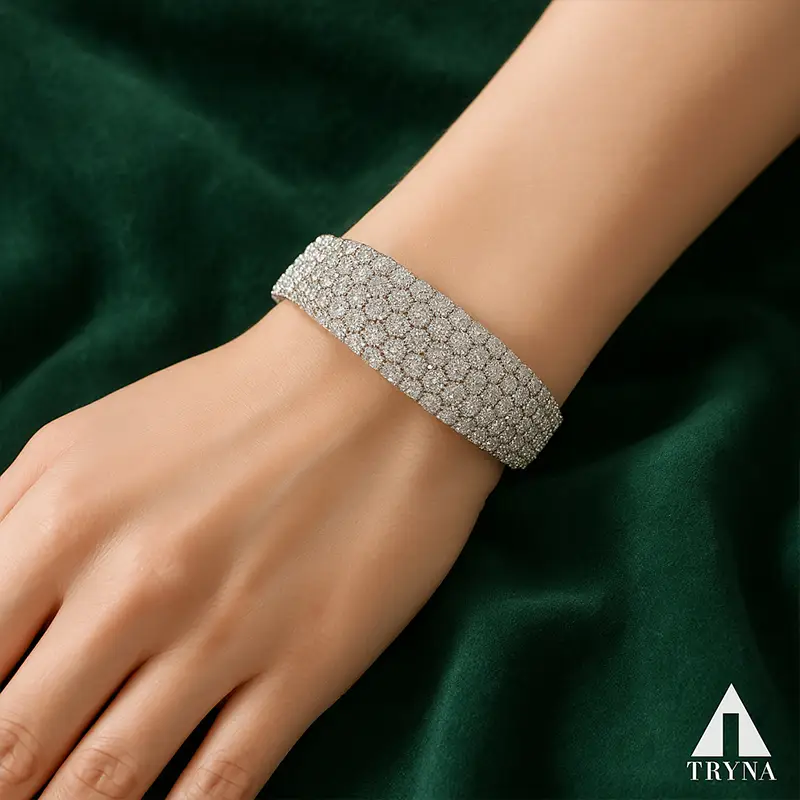 A sleek, tapered bangle paved with rows of brilliant CZ clusters for an “iced” diamond look. Clean, luxurious shine that pairs effortlessly with western and ethnic outfits.