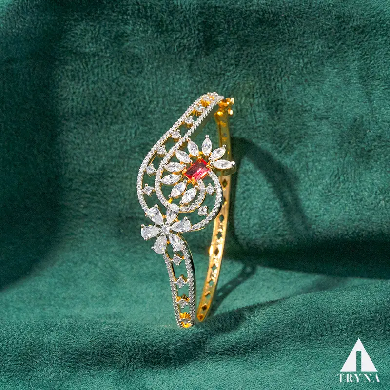 Gold-plated hinged kada/bangle with CZ and green accent; slim, elegant profile for solo wear or stacking.
