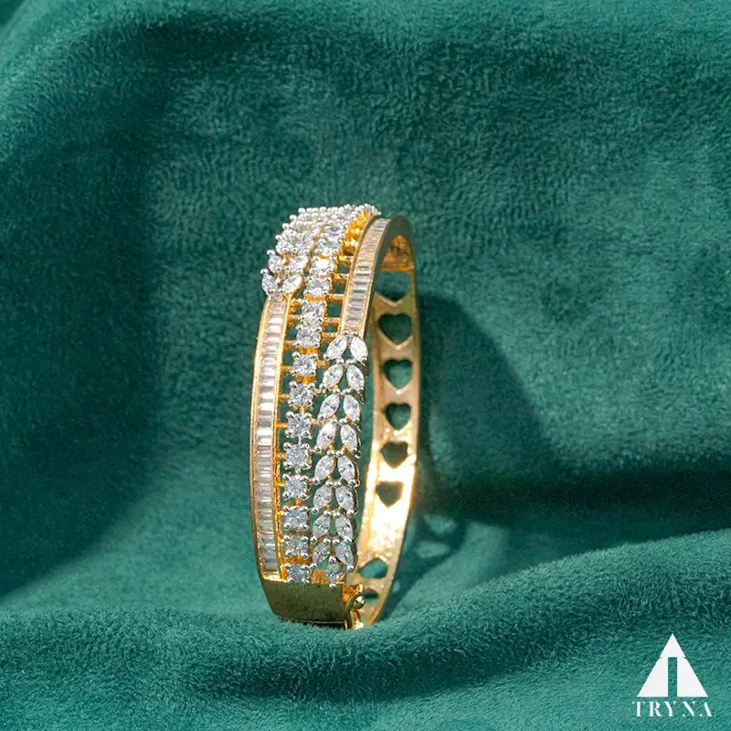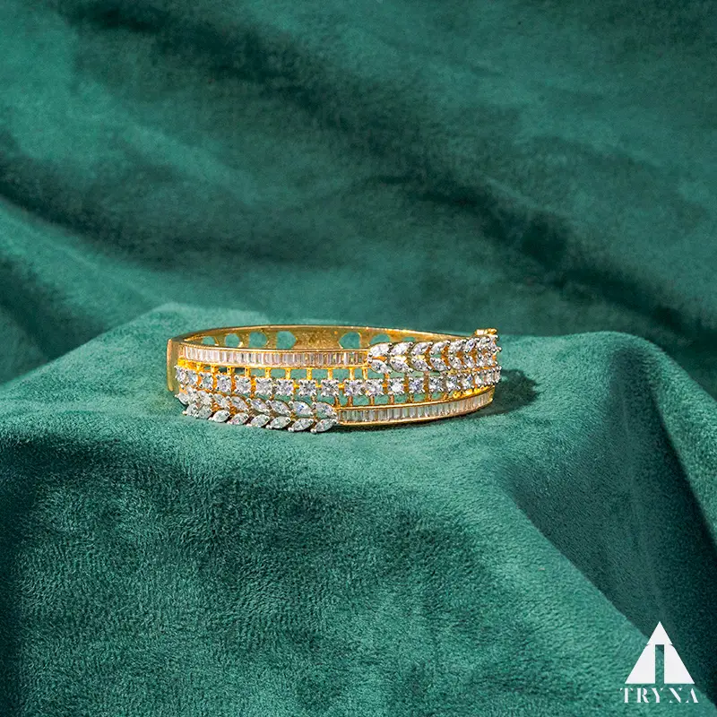 Gold-plated hinged kada/bangle with triple-row pavé and leaf cluster accent; tapered, comfortable fit.