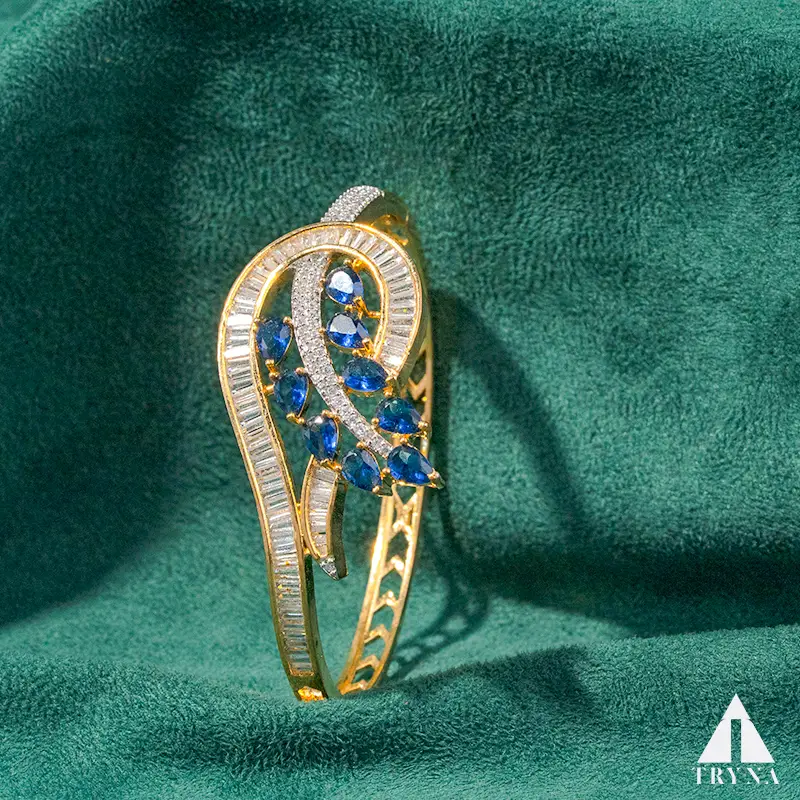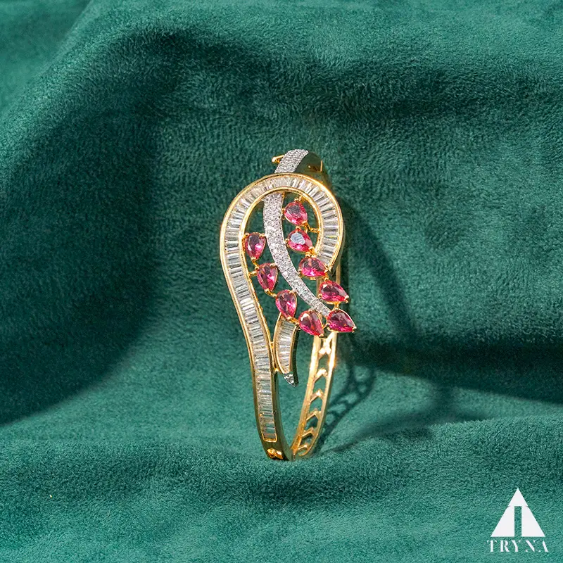 Gold-plated hinged kada/bangle with baguette CZ rows and ruby marquise cluster; tapered, stackable profile.
