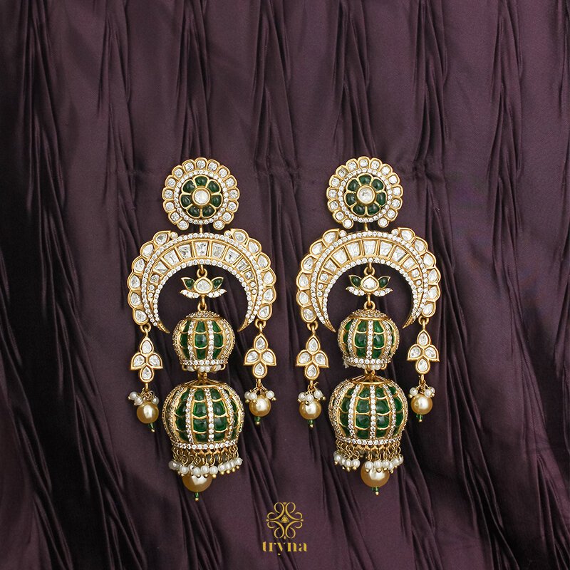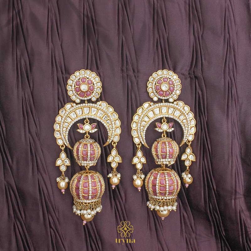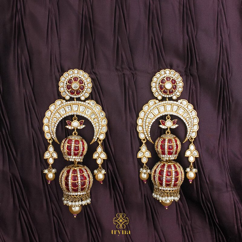Feel and Look: These earrings feature a majestic chandbali design, crafted with intricate kundan work, ruby-red stone highlights, and pearl droplet detailing. The layered symmetry and bold structure radiate regal charm, making them perfect for bridal or festive styling.