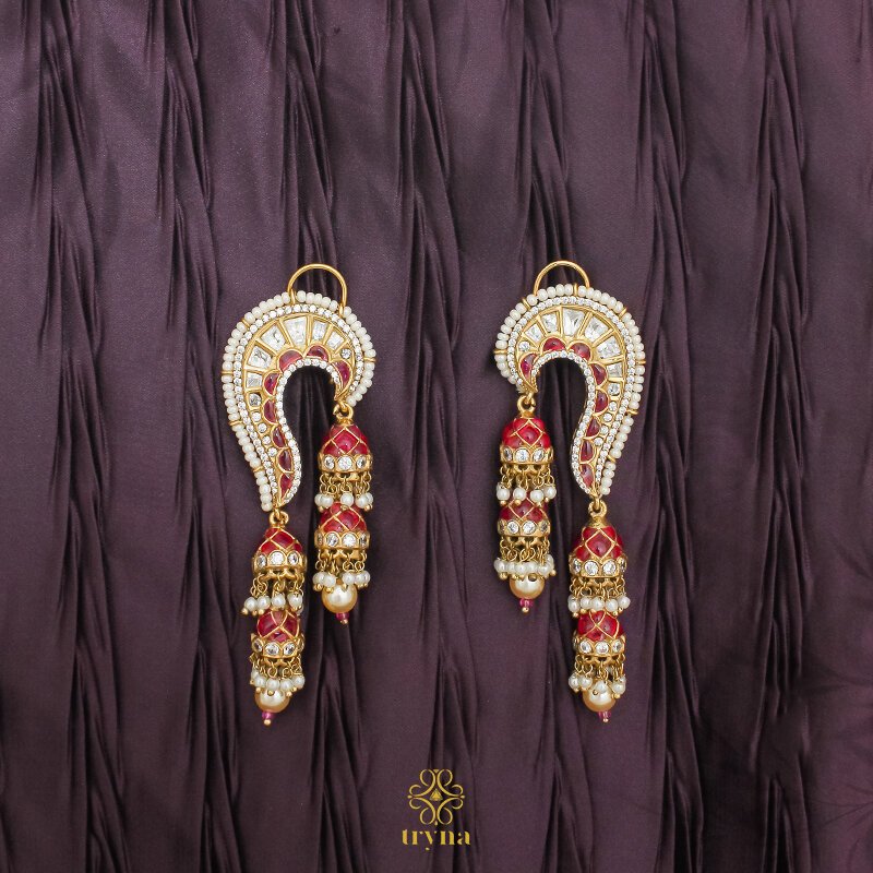 Feel and Look: These earrings feature a majestic chandbali design, crafted with intricate kundan work, ruby-red stone highlights, and pearl droplet detailing. The layered symmetry and bold structure radiate regal charm, making them perfect for bridal or festive styling.