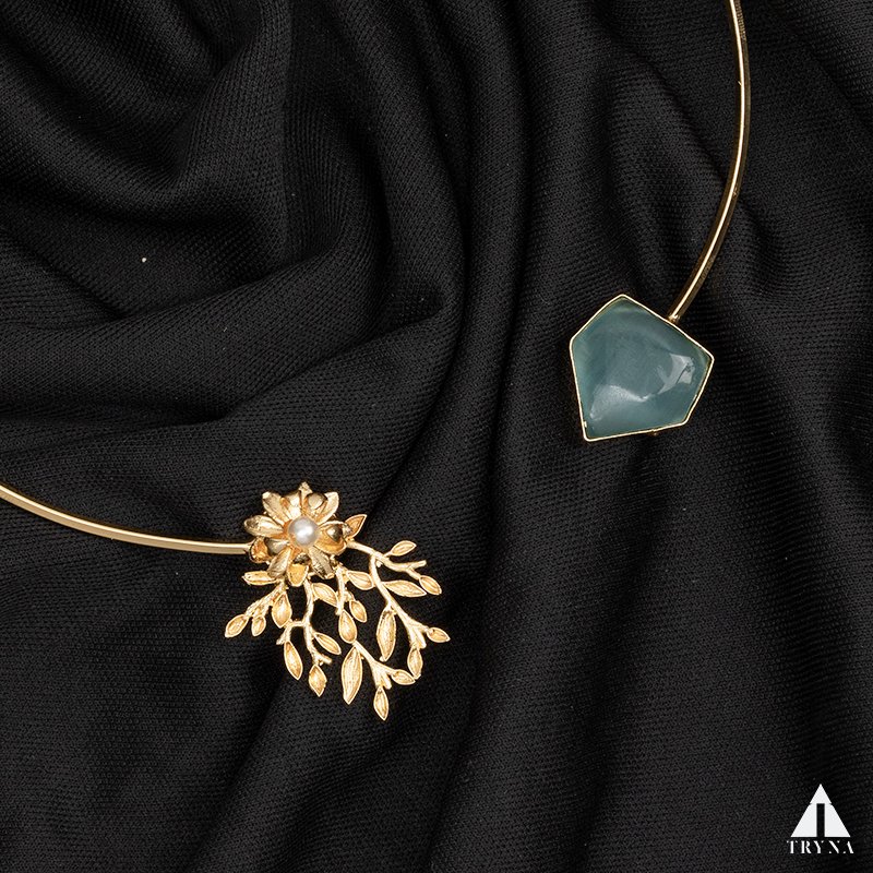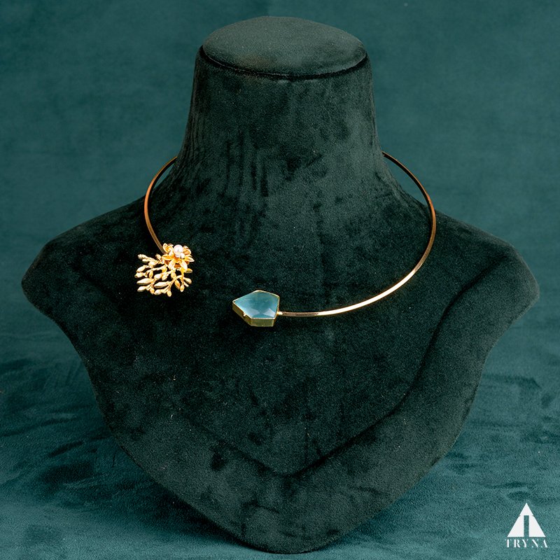 This open choker necklace showcases a striking contrast – a coral-inspired floral gold motif on one side and a raw-cut blue gemstone on the other. Its minimal yet bold style creates a balance of modern chic and natural elegance.