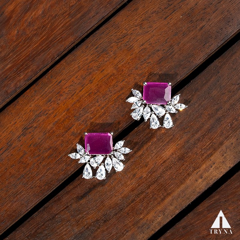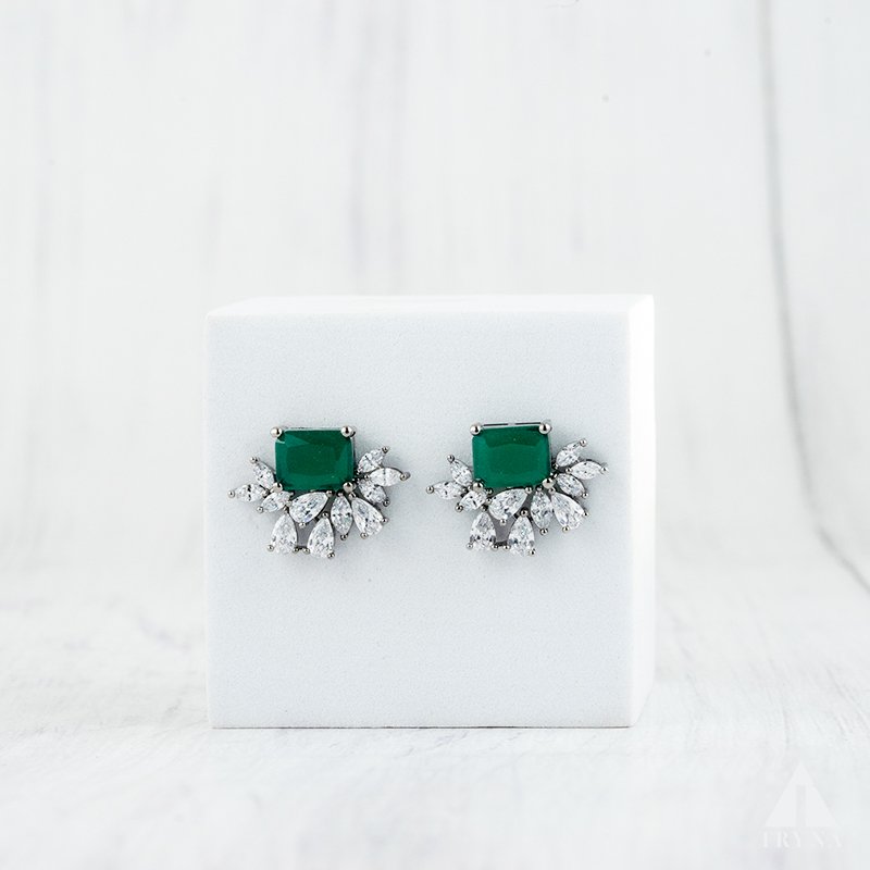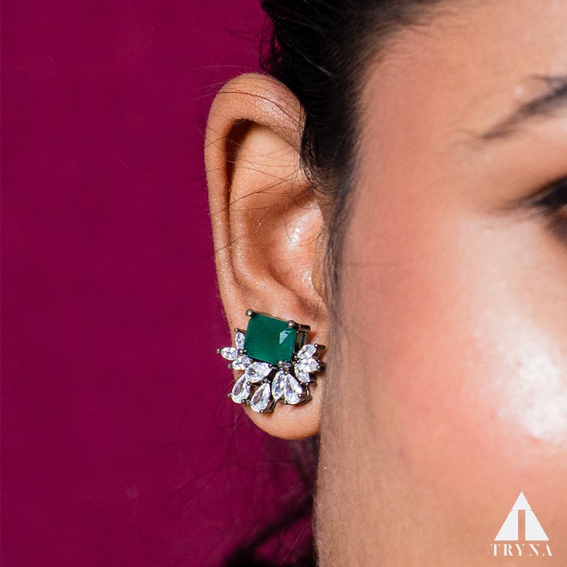 Feel and Look: These studs showcase a deep emerald-green square stone enhanced with a floral cluster of sparkling CZ diamonds. The rich contrast of green and white radiates sophistication and timeless charm.