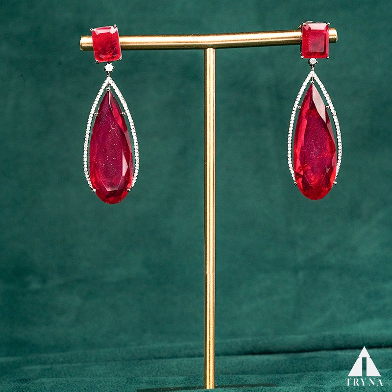 These earrings feature a bold rectangular amethyst-hued stone at the top, followed by a long teardrop gemstone framed with shimmering CZ diamonds. Their deep purple tone evokes luxury and royalty, making them perfect for statement styling with gowns, lehengas, or Indo-western ensembles.