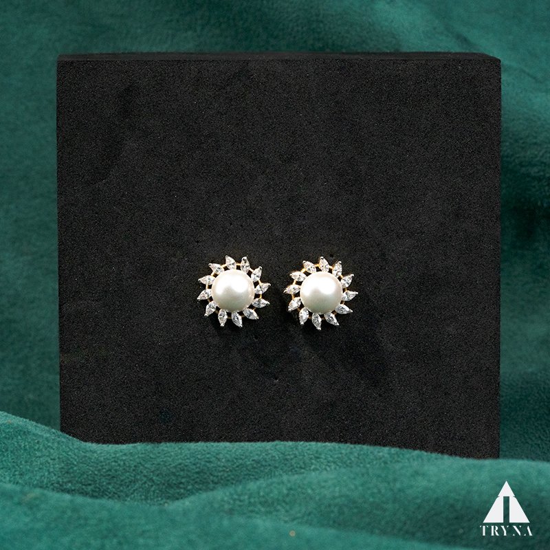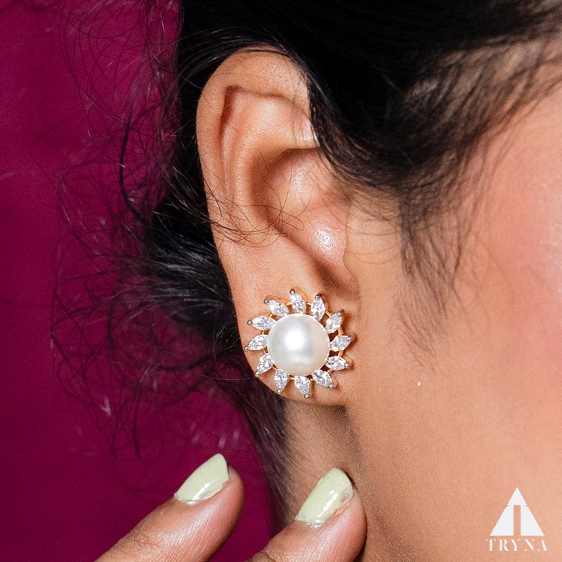Type and Style: Gold-plated stud earrings with pearls and CZ diamond accents, crafted in a timeless sunburst motif.