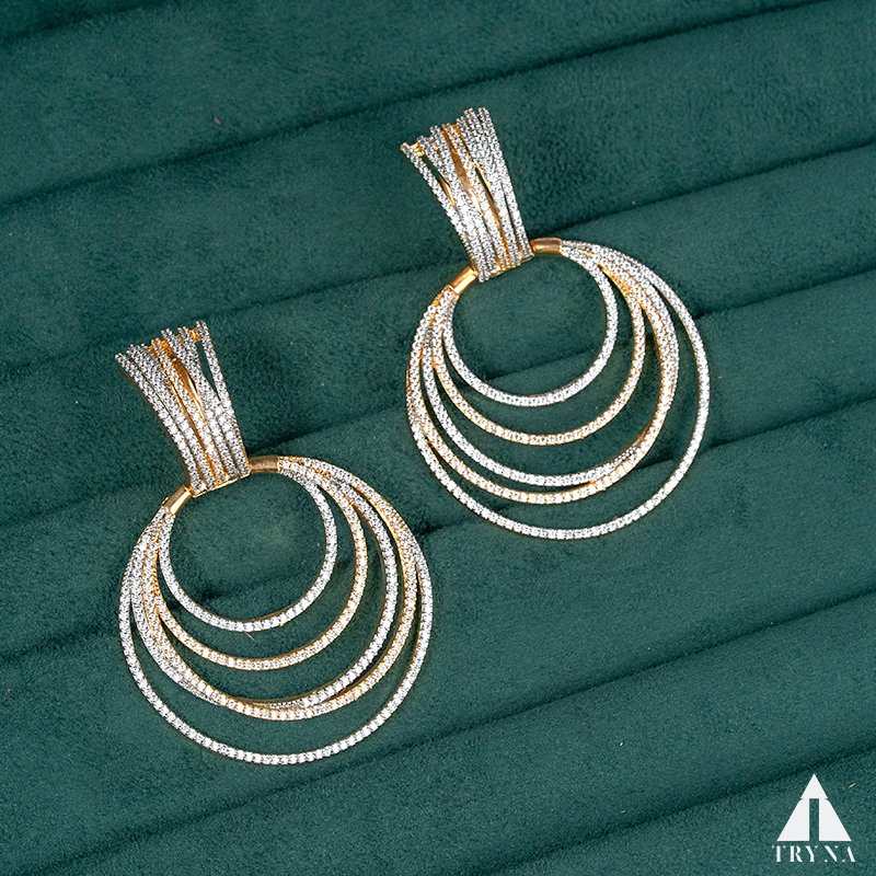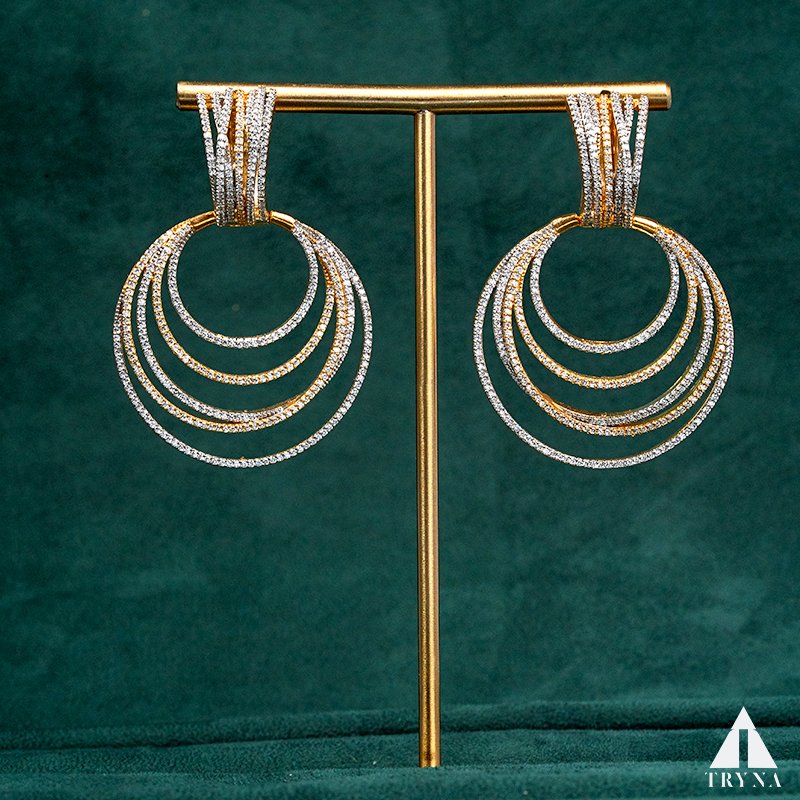 Luxurious and dazzling, these earrings feature cascading concentric circles set with CZ diamonds in a golden frame. Their bold yet elegant style ensures you stand out while maintaining sophistication.