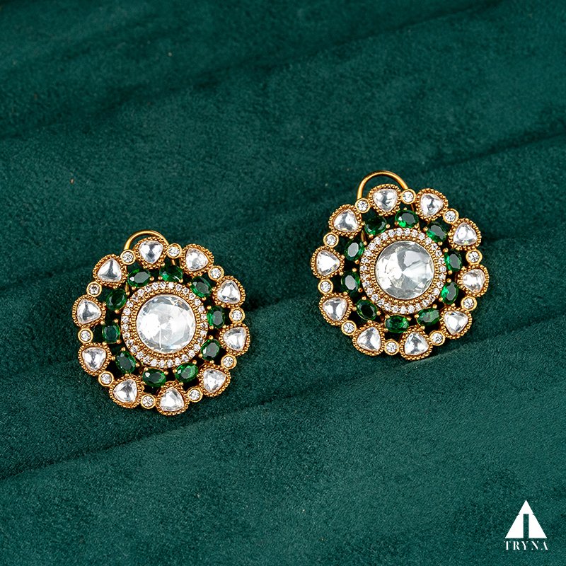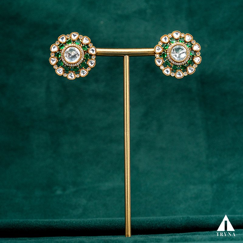 Type and Style: Gold-plated circular Kundan stud earrings with emerald accents. A regal piece blending traditional artistry with enduring sophistication.
