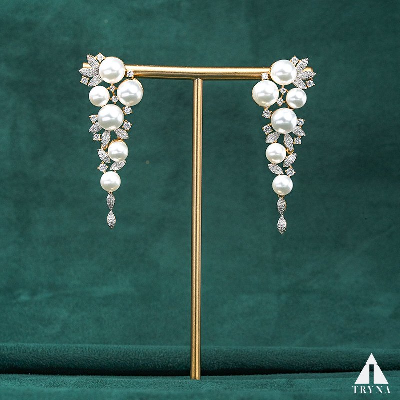 Feel and Look: Glamorous and graceful, these earrings feature clusters of luminous pearls framed by sparkling CZ diamonds in delicate leaf motifs. Their elongated design gives a chic yet regal flow, making them a true statement piece.