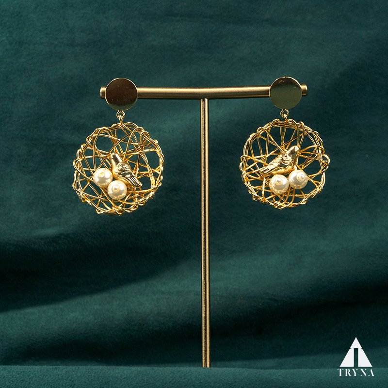 Gold-plated artistic dangler earrings, designed with an intricate nest-like frame and adorned with radiant pearls. A contemporary jewellery piece that blends luxury with creativity.