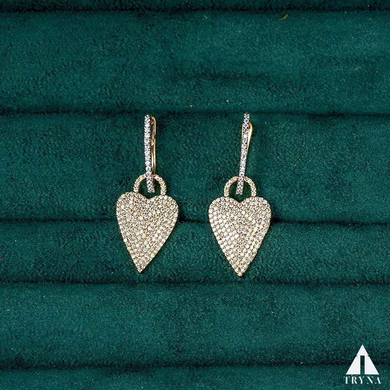 Type and Style: Gold-plated drop earrings in a heart silhouette, fully studded with American diamonds for a modern yet timeless statement style.