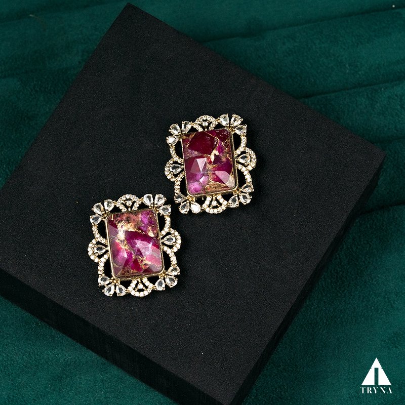 Type and Style: Antique-finish gold-plated square studs with ruby crystals and CZ embellishments – a perfect blend of royal charm and elegance.