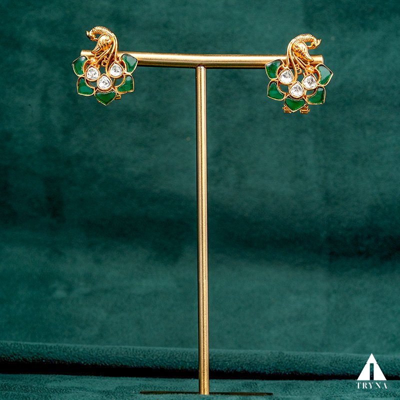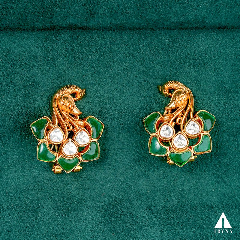 Type and Style: Antique gold-plated stud earrings with peacock-inspired detailing, green enamel accents, and CZ diamonds – a blend of cultural artistry and timeless fashion.