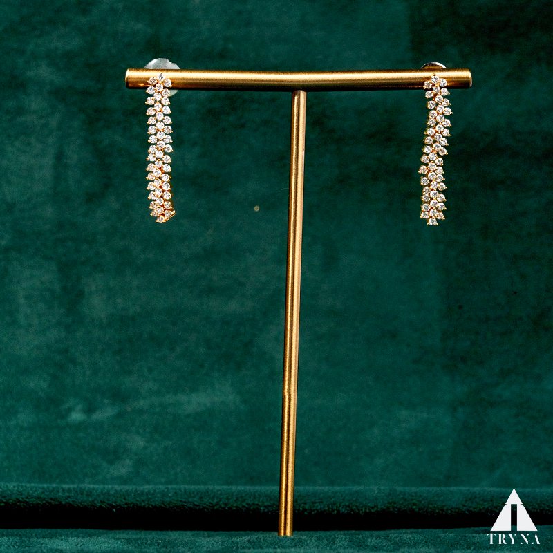 Feel and Look: These earrings feature a sleek cascading line of CZ diamonds set in gold, creating a graceful flow that catches the light with every movement. The minimalist yet glamorous design makes them a versatile statement piece.