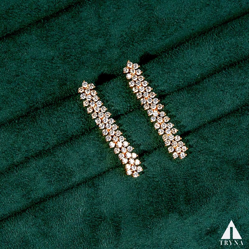 Type and Style: Gold-plated long dangler earrings with linear CZ diamond detailing. A chic blend of simplicity and sophistication for modern elegance.