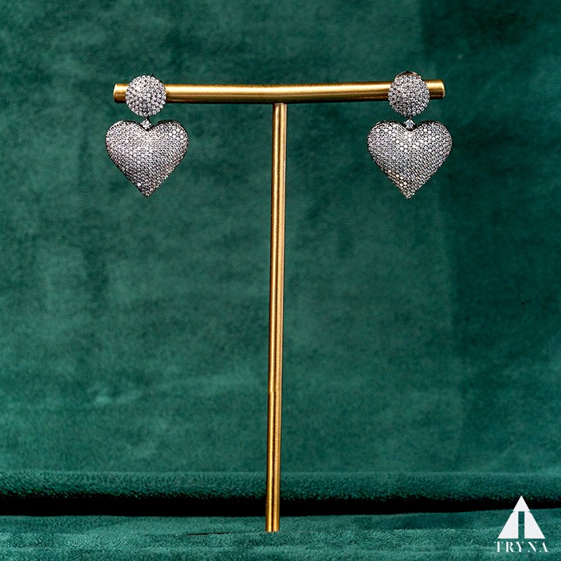 Feel and Look: These earrings feature a bold heart-shaped design, encrusted with sparkling CZ diamonds. The dazzling shimmer gives them a chic and glamorous appeal, making them the ultimate statement of elegance and love.