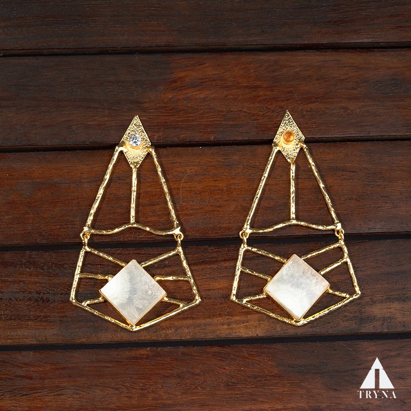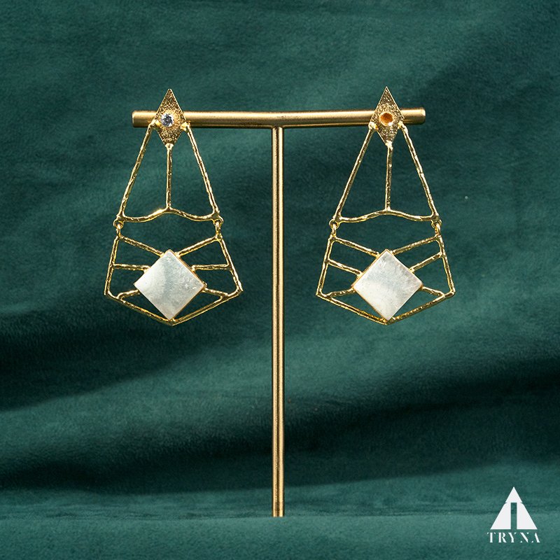 Modern and chic, these earrings showcase a bold triangular frame with stone accents. They add a sharp and sophisticated touch to any outfit.