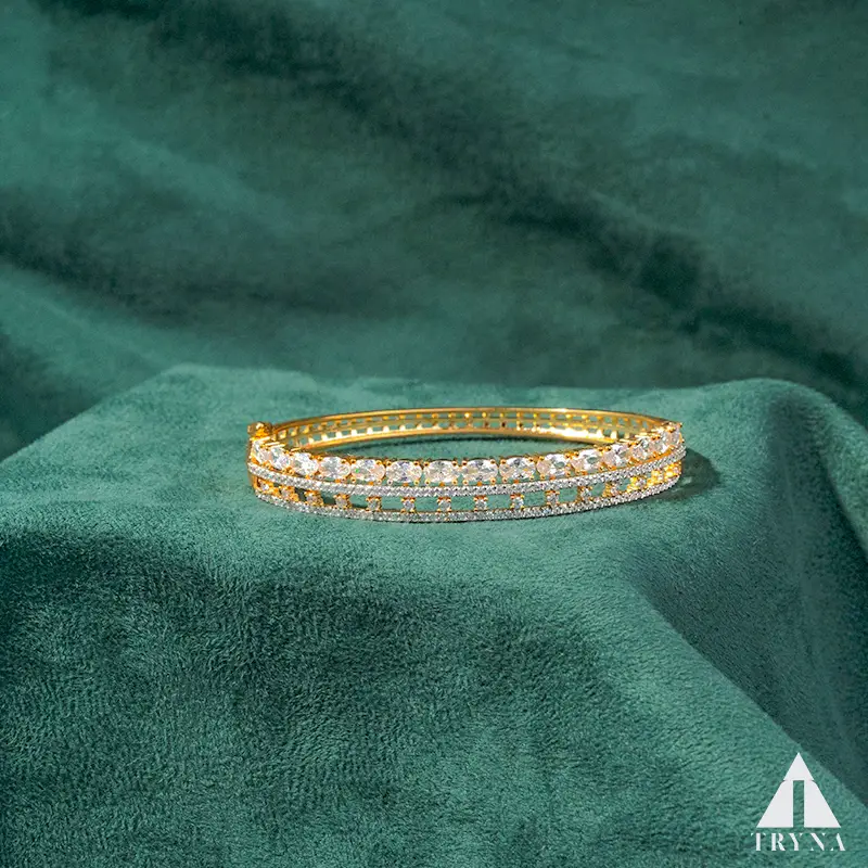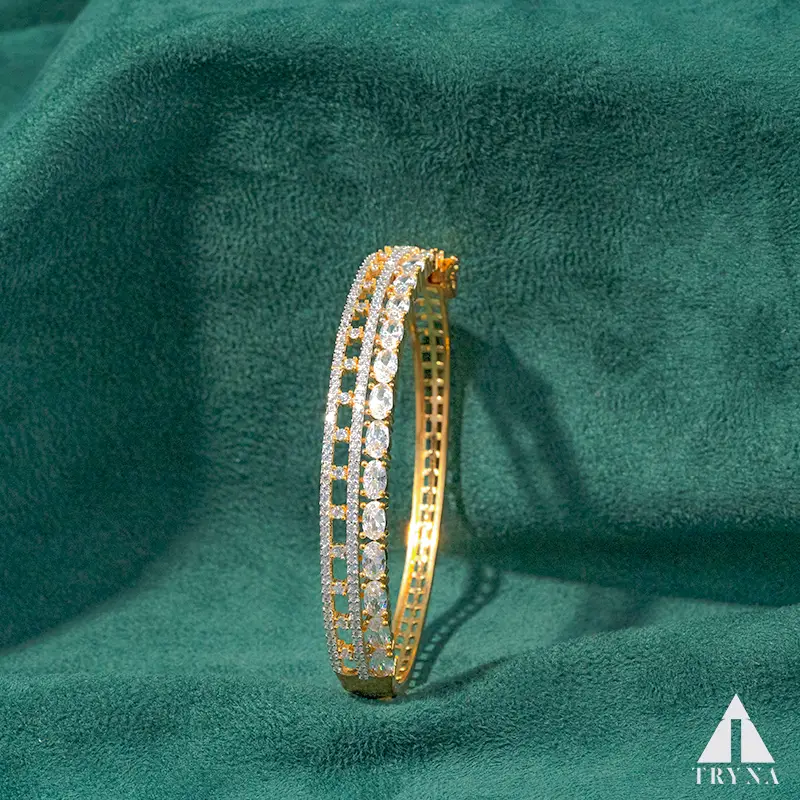 Gold-plated hinged kada/bangle with oval-solitaire link row, micro-pavé rail, and geometric lattice sides; slim, structured silhouette.