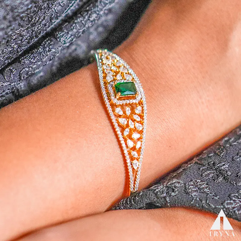 Gold-plated hinged kada/bangle with emerald-green center stone, lattice (marquise) detailing, and pavé borders; slim, wrist-flattering silhouette.