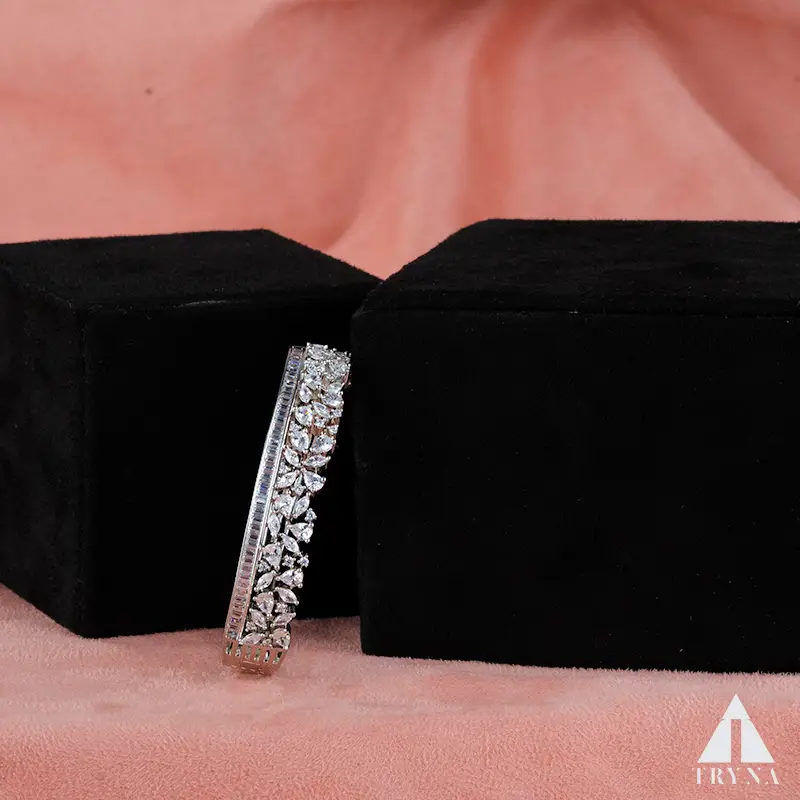 A sleek gold bangle framed with a baguette-set edge and a lush marquise–pear CZ vine. Balanced, high-shine sparkle with a refined designer look—perfect solo or stacked.