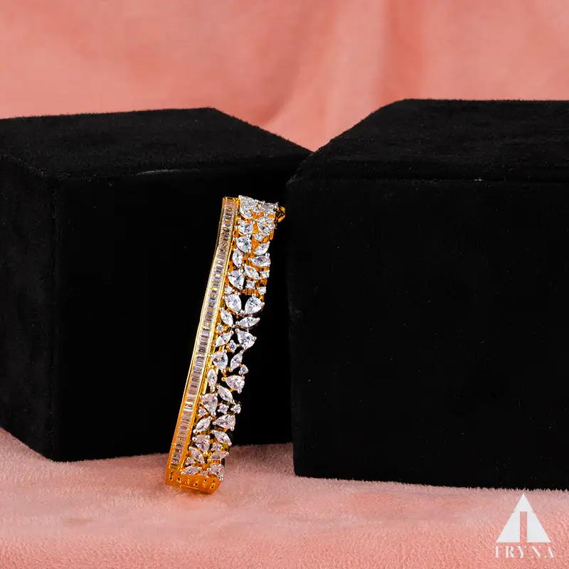 Gold-plated hinged kada/bangle with baguette border and leaf-vine cluster; slim, structured silhouette.