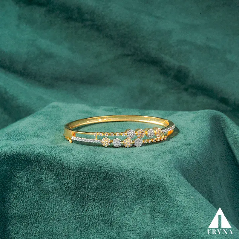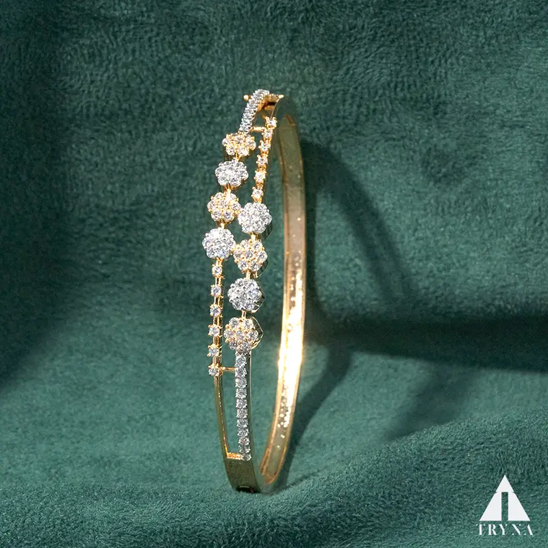 Gold-plated hinged kada/bangle with dual rails and vertical solitaire cluster; slim, stackable silhouette.