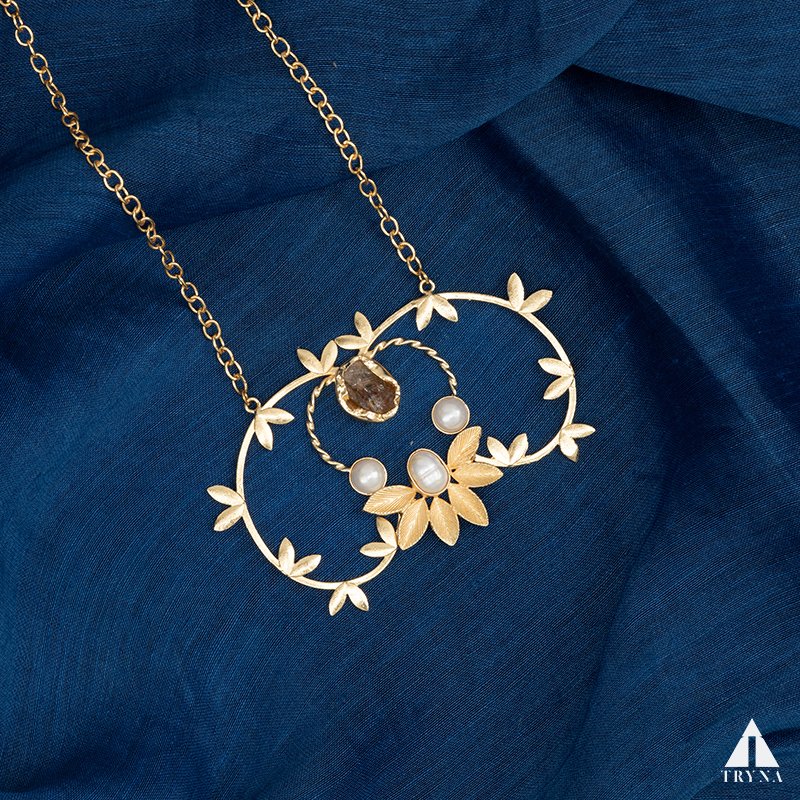 This necklace features a graceful golden floral design with delicate detailing, highlighted with pearl accents. It combines a natural charm with regal sophistication, giving your look a radiant finish.