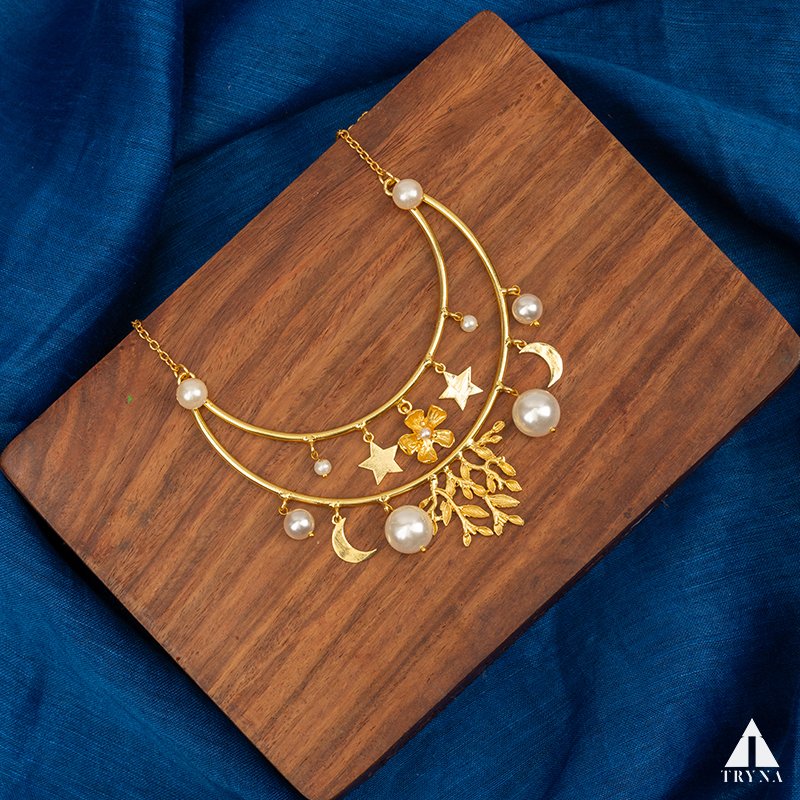 This necklace exudes a dreamy and mystical vibe, featuring gold-plated arcs adorned with delicate pearls, crescent moons, twinkling stars, and a floral charm. It creates a celestial elegance that’s modern yet timeless.