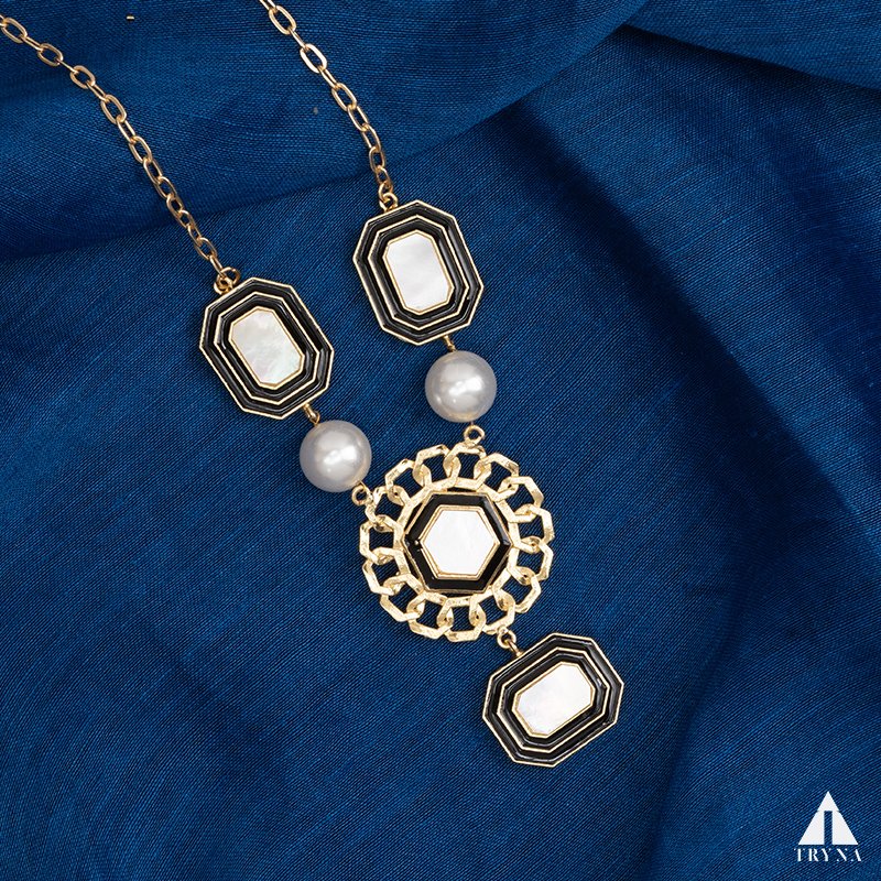 A striking blend of modern geometry and classic elegance, this necklace features black enamel frames with white inlays, accented by lustrous pearls. The bold pendant design creates a powerful statement, ideal for women who love unique, high-fashion jewellery.