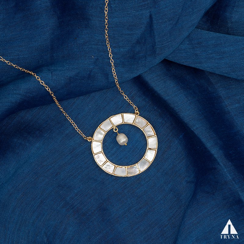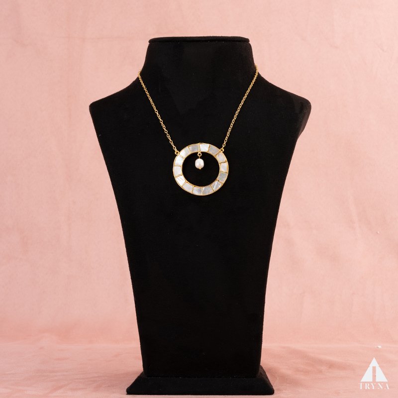 This necklace features a radiant circular pendant inlaid with luminous mother-of-pearl tiles, holding a delicate pearl drop at the center. The design balances minimalism and elegance, making it a versatile statement piece.