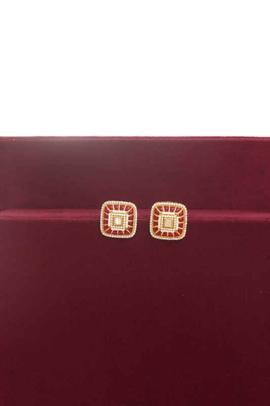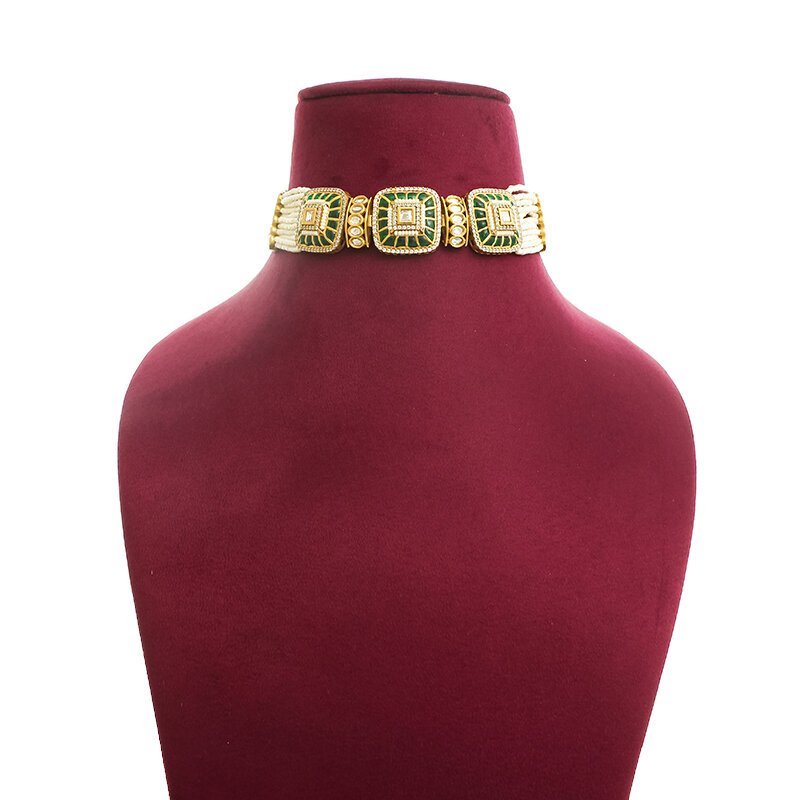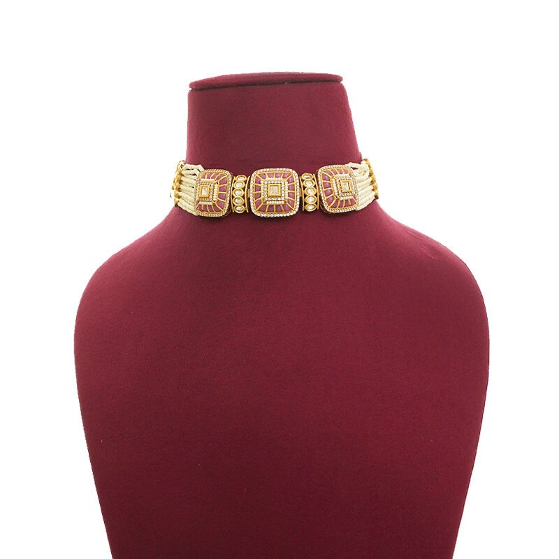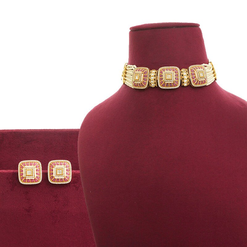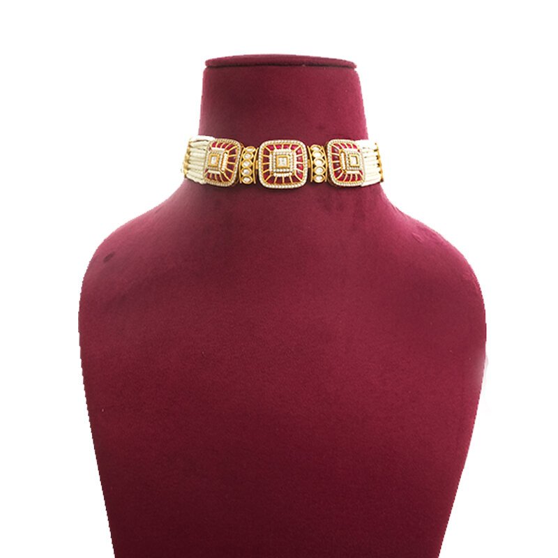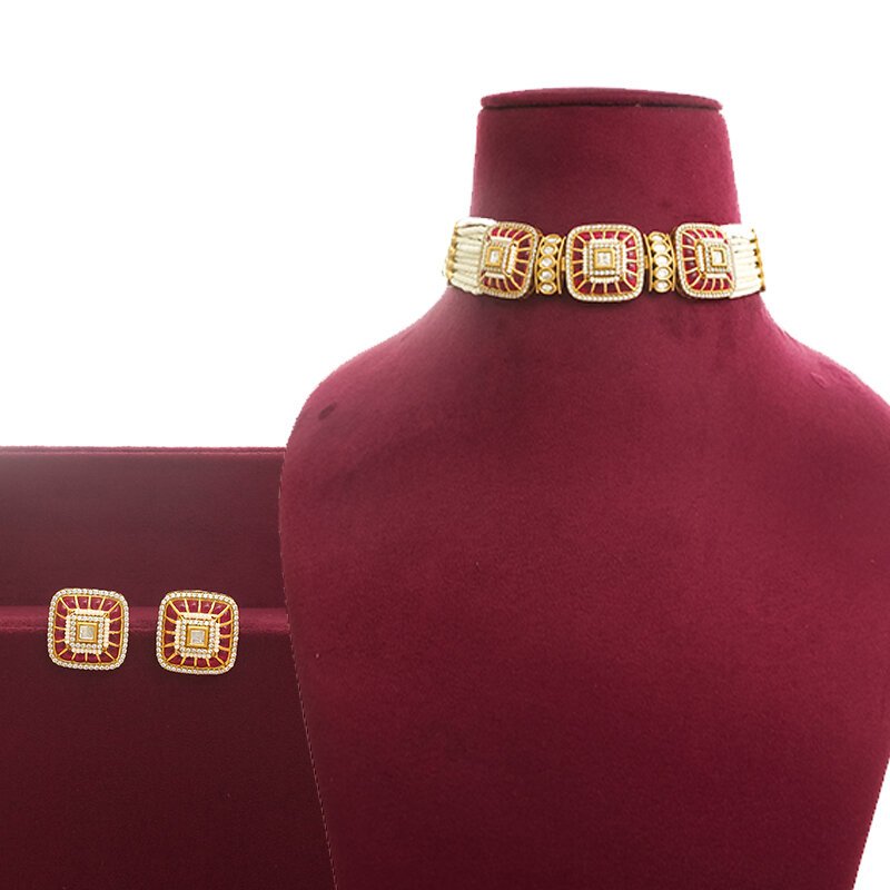 Type and Style: Gold-plated kundan necklace set with matching earrings, featuring red stones and polki accents. A heritage-inspired statement piece crafted for bridal and festive elegance.