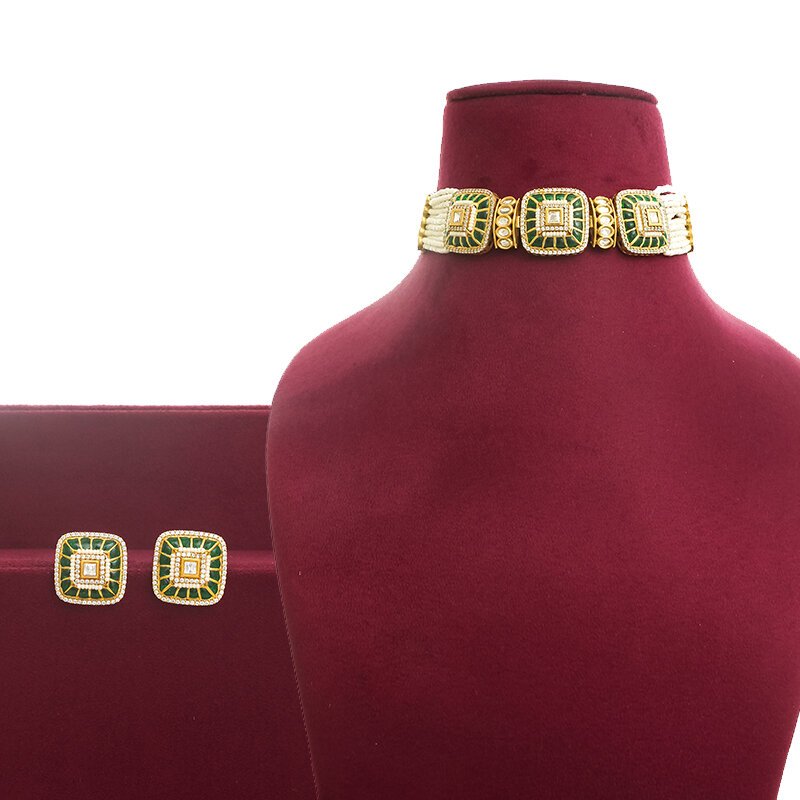Feel and Look: This necklace set radiates royal grandeur with its deep red kundan stones paired with sparkling polki detailing. The teardrop pendant and matching earrings exude richness, giving a timeless charm that enhances ethnic and bridal ensembles.
