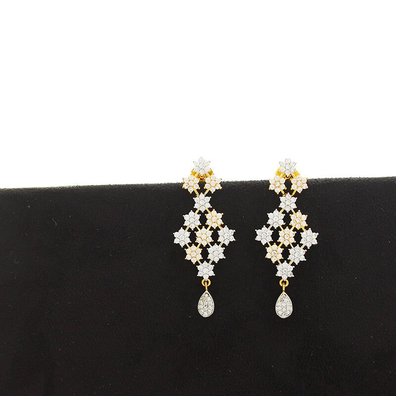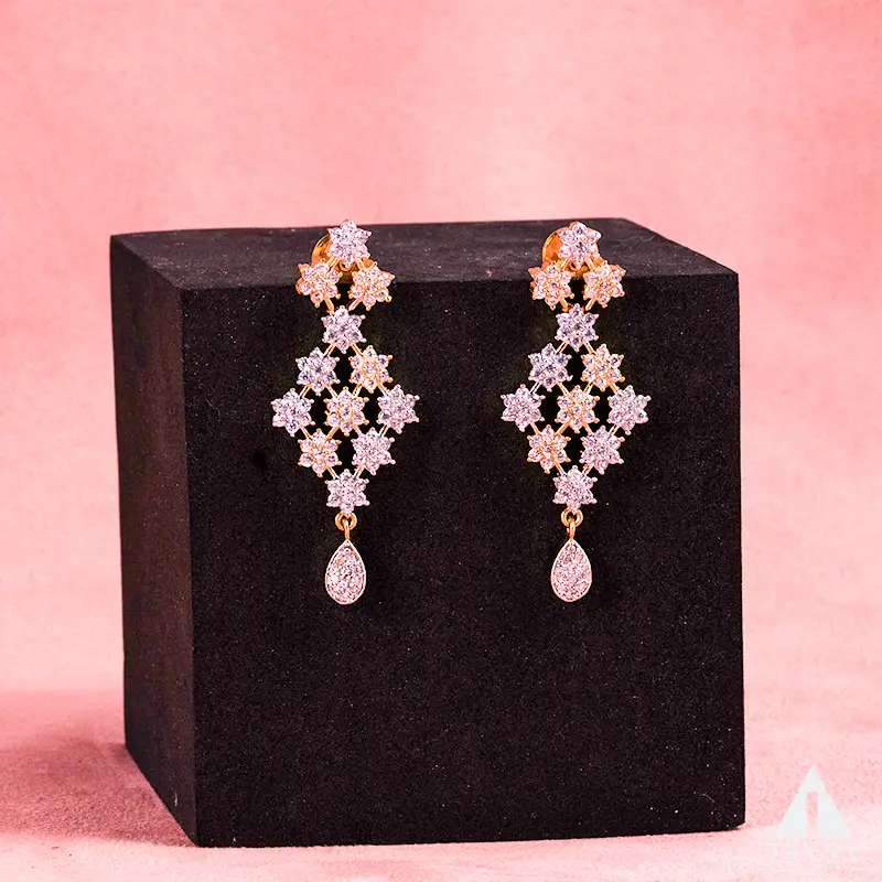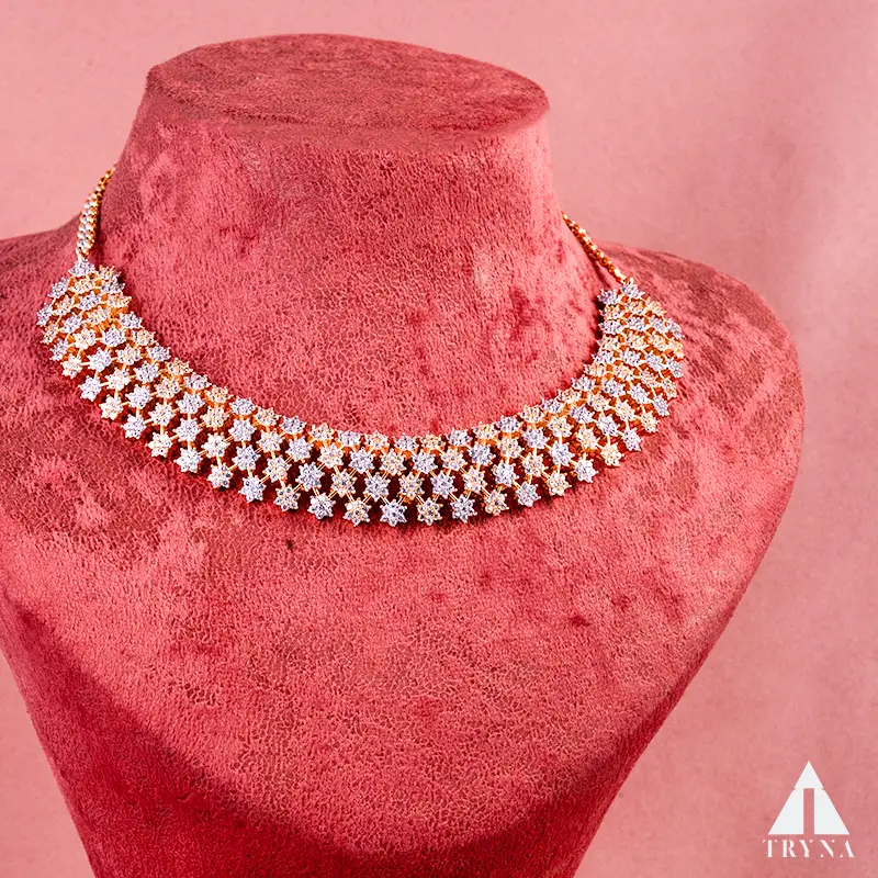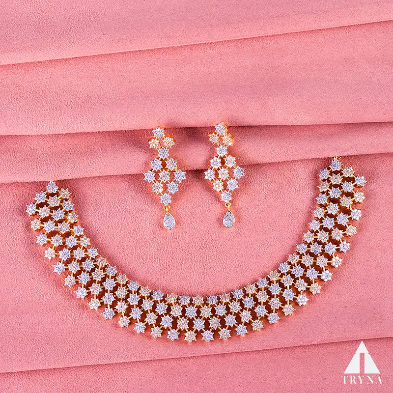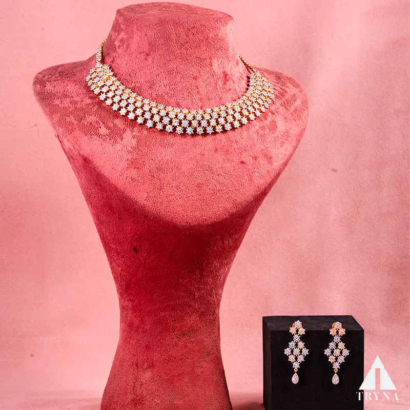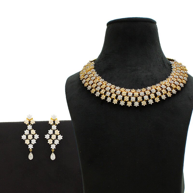 Elegant and regal, this necklace set features an intricate arrangement of floral motifs adorned with sparkling cubic zirconia in a gold-plated finish. The matching drop earrings add extra charm, making it the perfect choice for pairing with lehengas, sarees, and gowns.