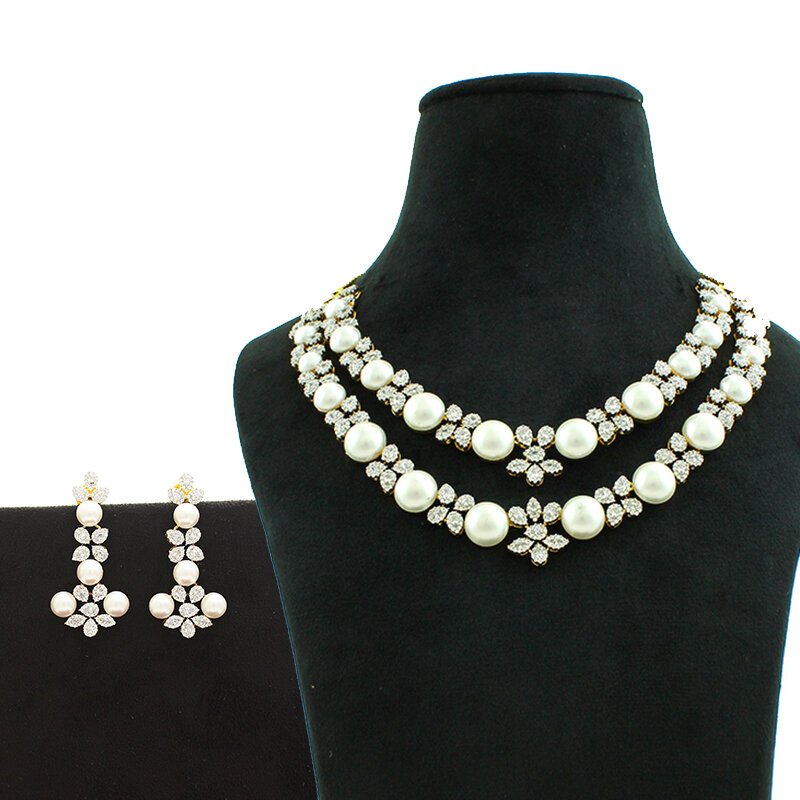 Silver-plated layered pearl necklace with floral CZ accents and matching long earrings. Crafted for bridal grandeur, this set blends pearls with shimmering crystals for a regal yet modern style.