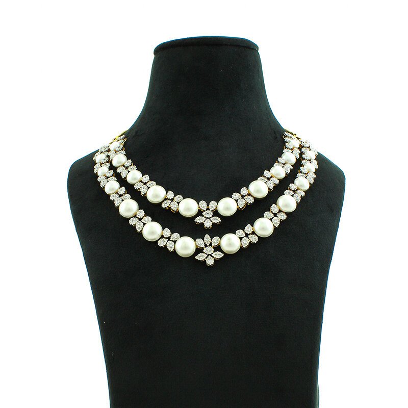 Elegant and timeless, this necklace set features two rows of lustrous pearls surrounded by floral cubic zirconia clusters. The matching long earrings mirror the design, making it a stunning statement set for bridal and festive looks.