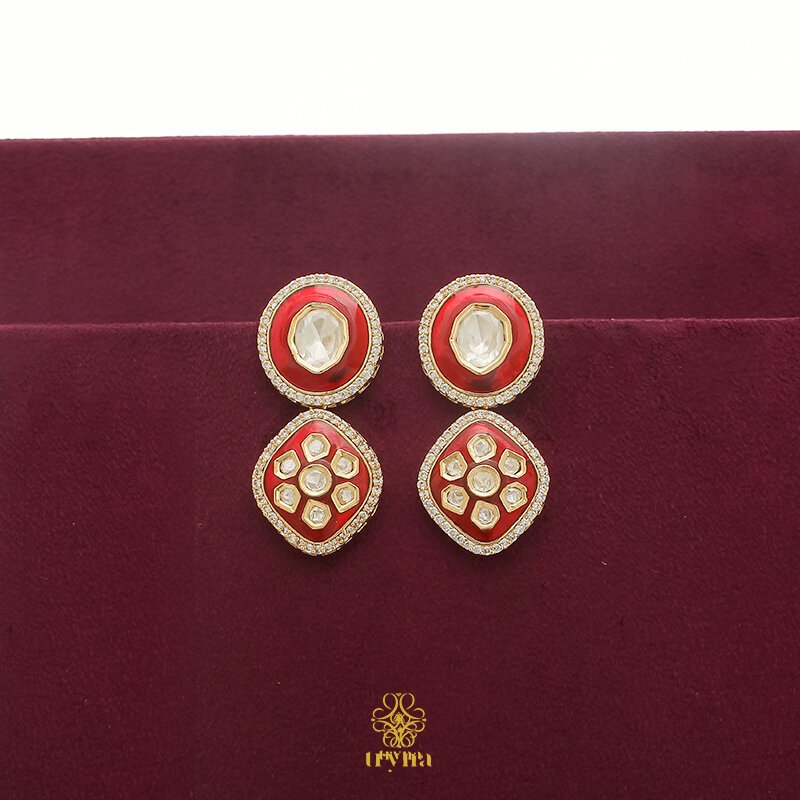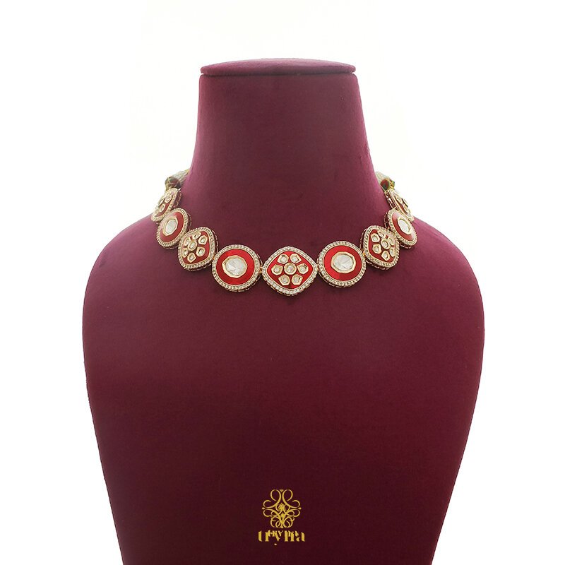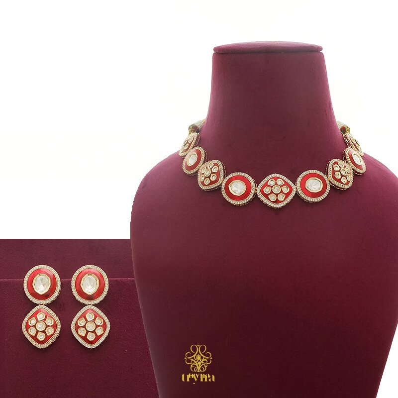 Type and Style: Gold-plated kundan necklace set with matching earrings, featuring red stones and polki accents. A heritage-inspired statement piece crafted for bridal and festive elegance.