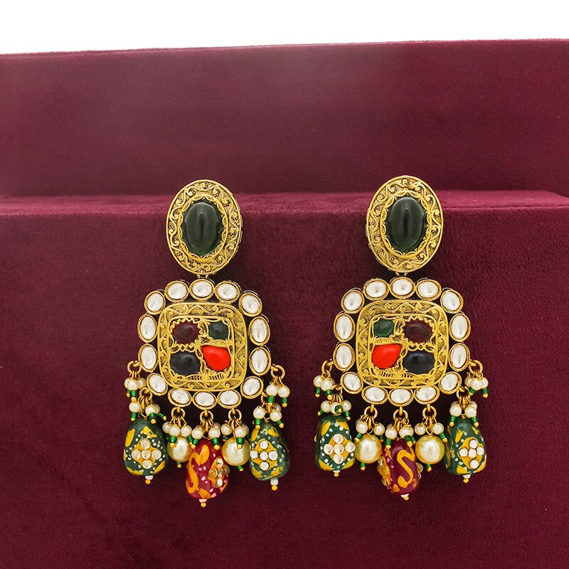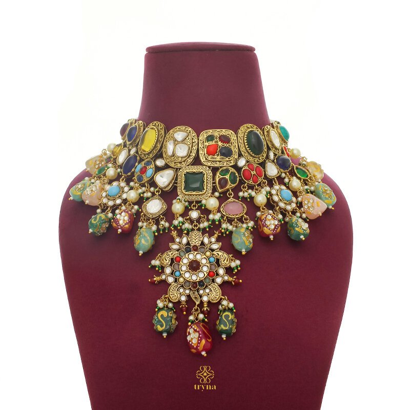 Type and Style: Gold-plated kundan necklace set with matching earrings, featuring red stones and polki accents. A heritage-inspired statement piece crafted for bridal and festive elegance.