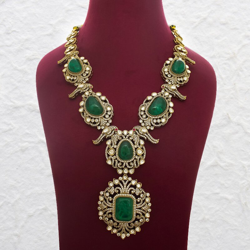 Feel and Look: This necklace set radiates royal grandeur with its deep red kundan stones paired with sparkling polki detailing. The teardrop pendant and matching earrings exude richness, giving a timeless charm that enhances ethnic and bridal ensembles.
