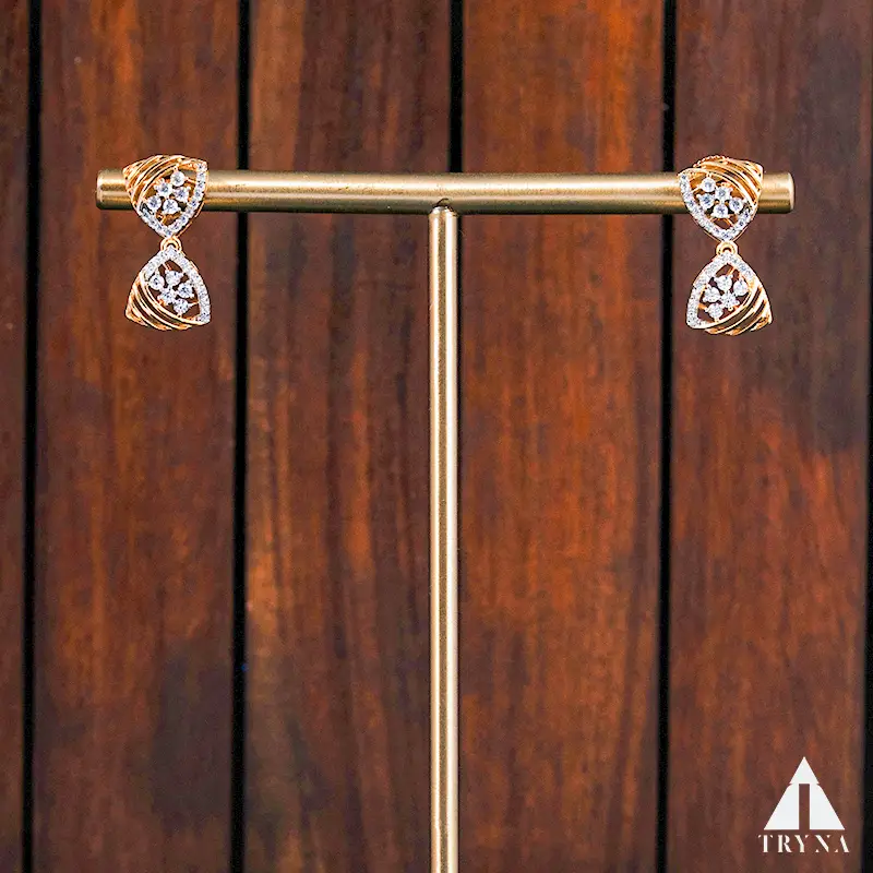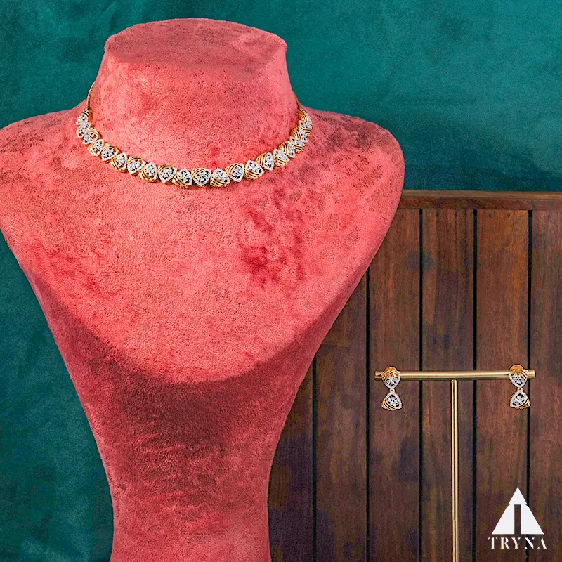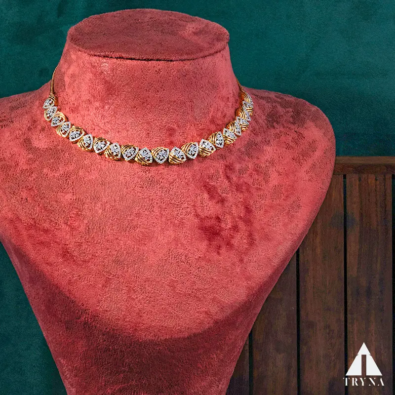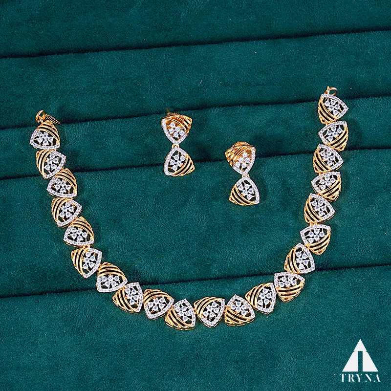 Trendy and elegant, this necklace features geometric triangular motifs encrusted with cubic zirconia, paired with golden cage-like detailing. The unique design gives it a modern luxe appeal, making it ideal for statement wear.