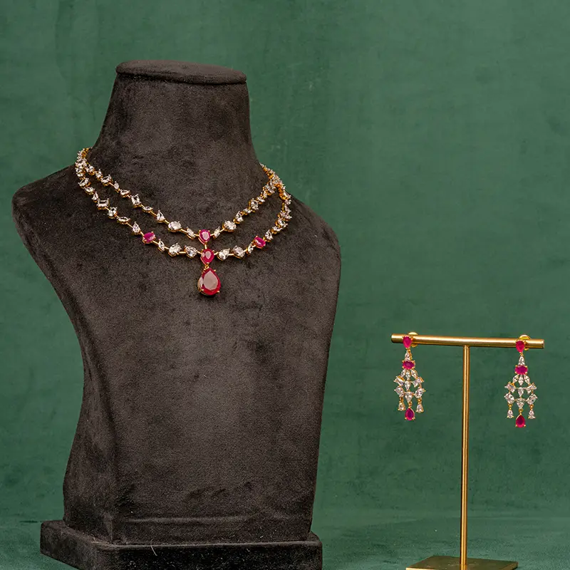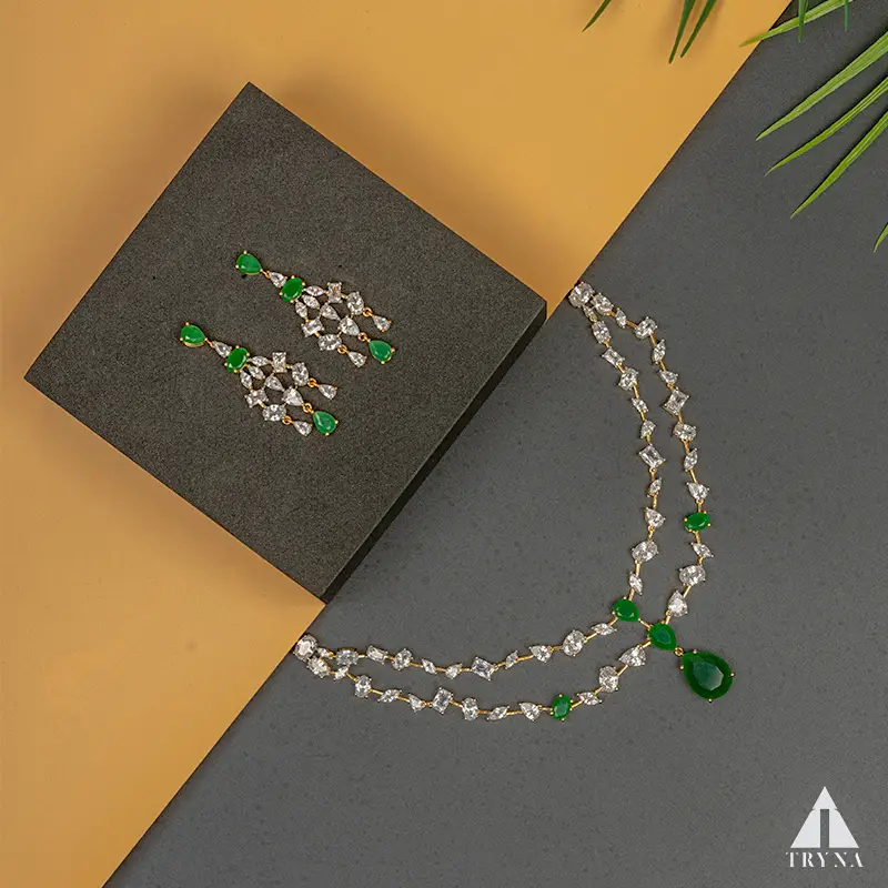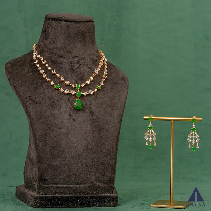 This exquisite necklace features a dual-layer design adorned with sparkling CZ diamonds and vibrant emerald green drops, finished with a teardrop centerpiece for added elegance. The matching long dangler earrings bring balance and sophistication, offering a graceful yet bold look. Lightweight compared to heavy bridal chokers, it provides comfort without losing its royal charm.