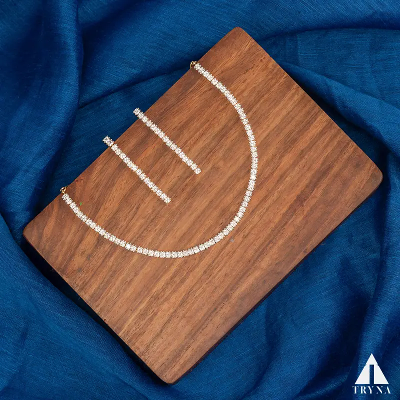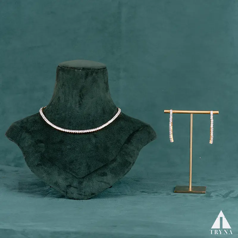 This exquisite necklace and earring set features vibrant emerald green drops paired with dazzling CZ diamonds. The design blends a royal charm with contemporary elegance, giving a graceful and sophisticated look. The dangling pearl-style drops add movement and refinement, making it perfect for statement styling.