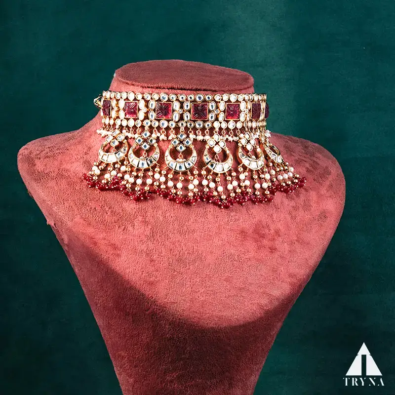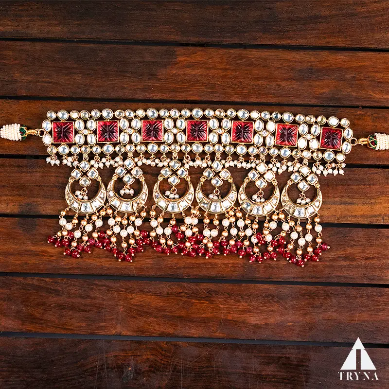 Type and Style: Heavy bridal choker with layered pearl fringe, kundan setting, and ruby square stones.