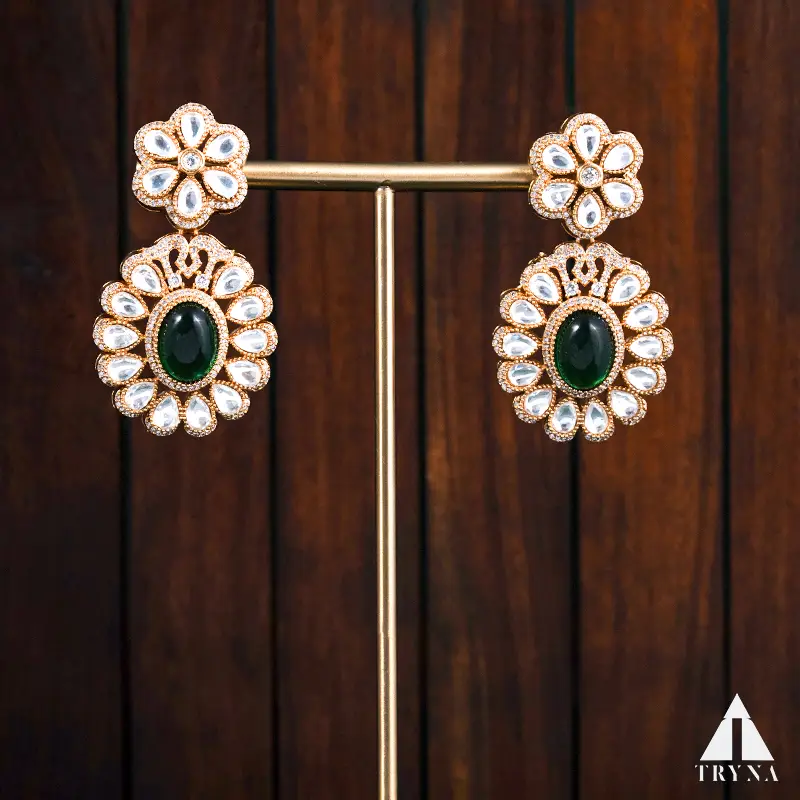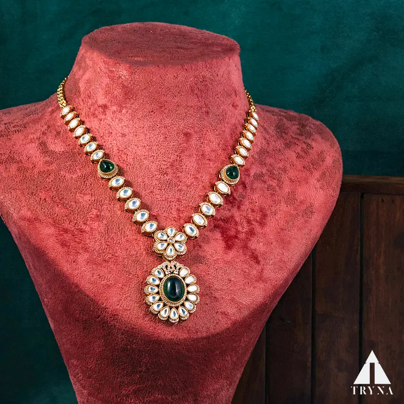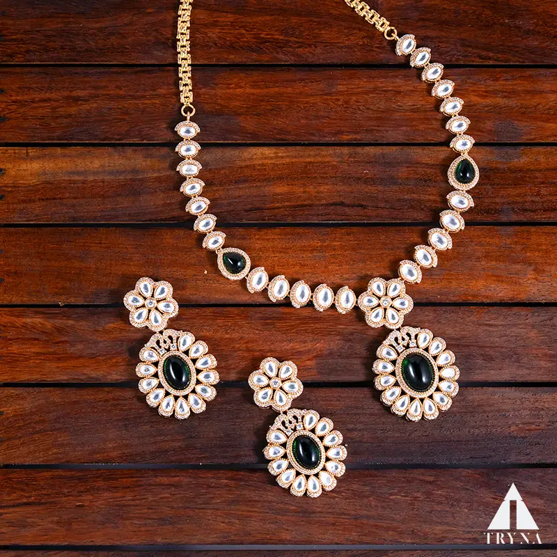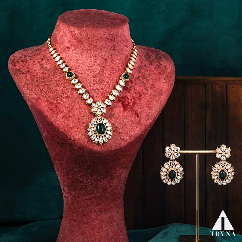 A regal necklace featuring lustrous Kundan stones paired with bold black oval stones. The floral centerpiece and matching pendant drop create a luxurious and timeless design, perfect for pairing with sarees, lehengas, and festive gowns.