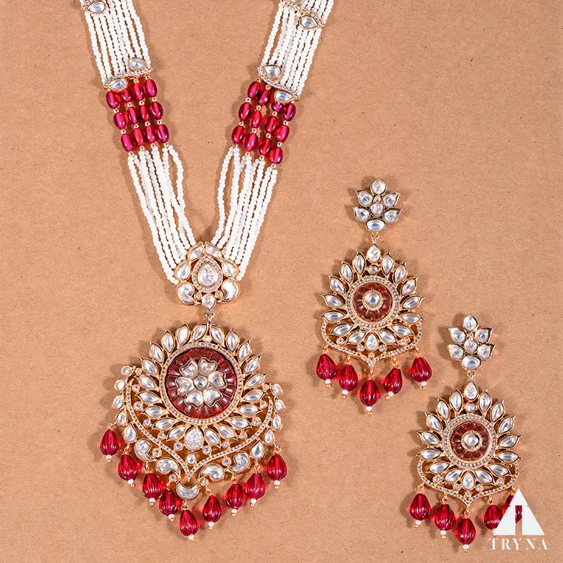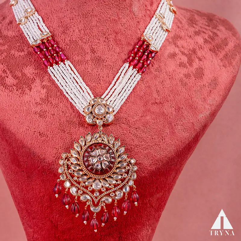 Gold-plated multi-strand pearl necklace with Kundan-studded pendant and ruby-red beads. Traditional Indian bridal jewelry designed to complement lehengas, sarees, and festive attire.