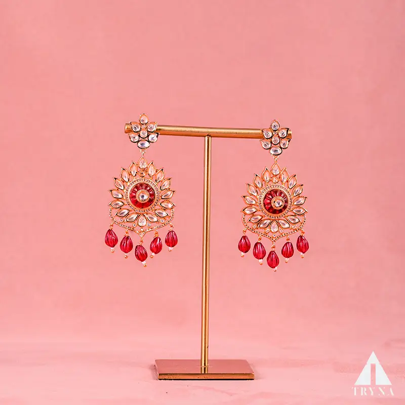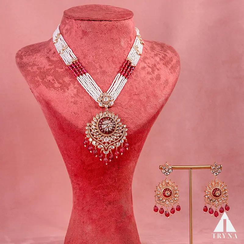 Regal and majestic, this necklace features multiple strands of delicate pearls enhanced with ruby-red beads. The centerpiece is an oversized circular pendant with intricate Kundan detailing and ruby drop hangings, giving it a luxurious heritage look.