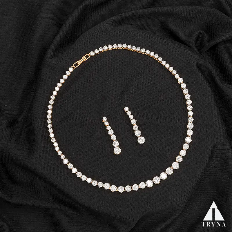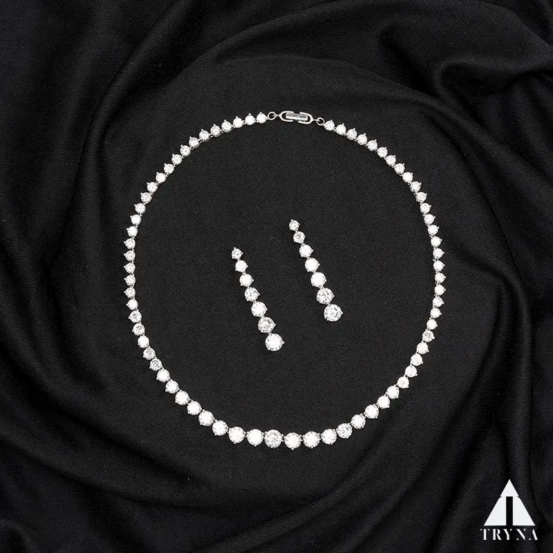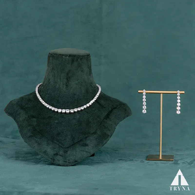 This exquisite necklace and earring set features vibrant emerald green drops paired with dazzling CZ diamonds. The design blends a royal charm with contemporary elegance, giving a graceful and sophisticated look. The dangling pearl-style drops add movement and refinement, making it perfect for statement styling.
