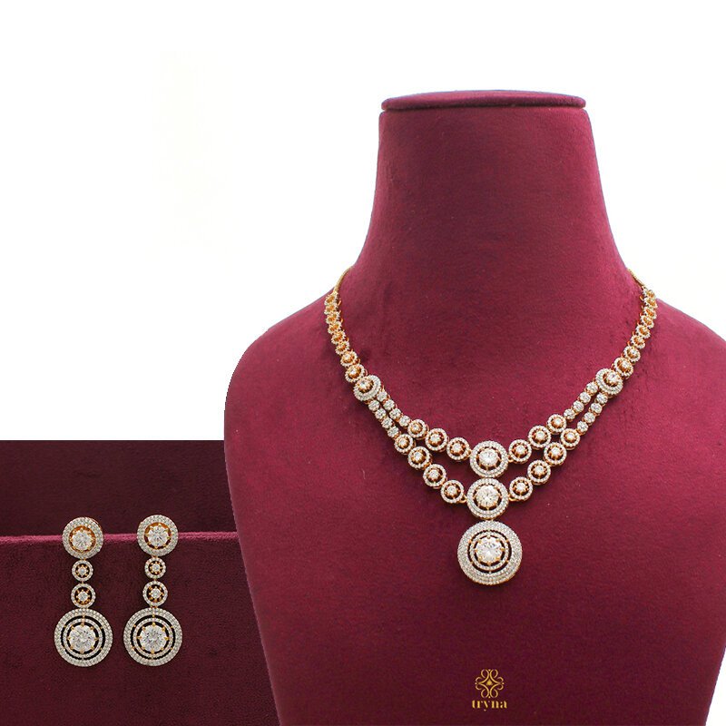 This exquisite necklace and earring set features vibrant emerald green drops paired with dazzling CZ diamonds. The design blends a royal charm with contemporary elegance, giving a graceful and sophisticated look. The dangling pearl-style drops add movement and refinement, making it perfect for statement styling.