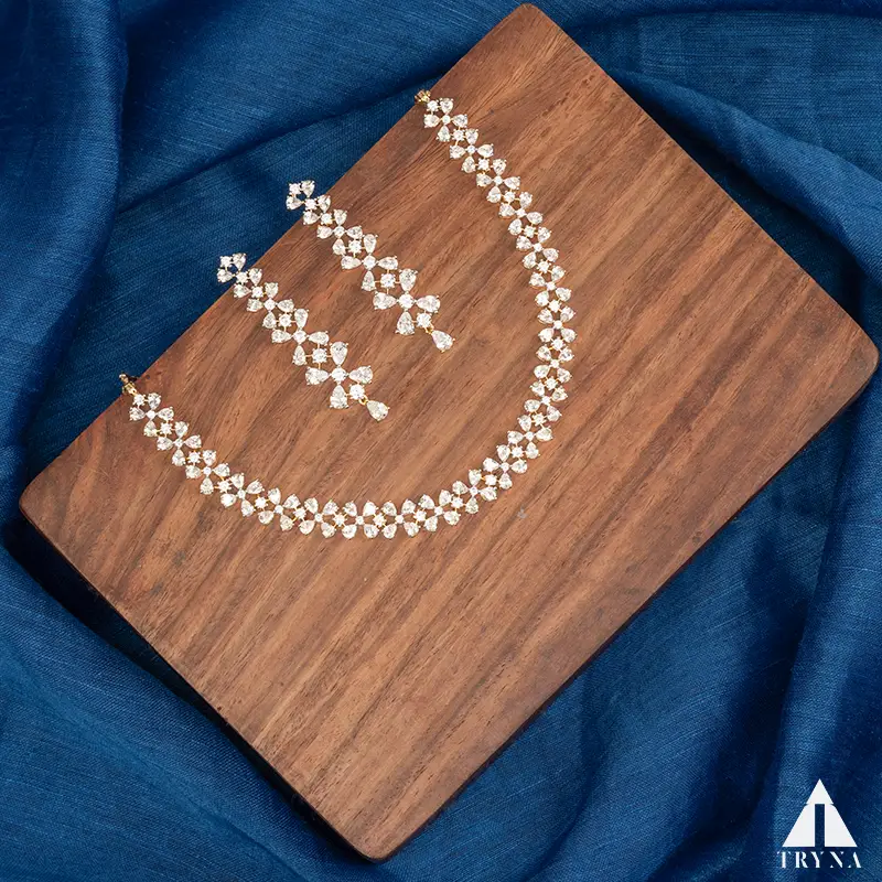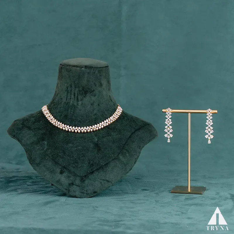 This exquisite necklace and earring set features vibrant emerald green drops paired with dazzling CZ diamonds. The design blends a royal charm with contemporary elegance, giving a graceful and sophisticated look. The dangling pearl-style drops add movement and refinement, making it perfect for statement styling.